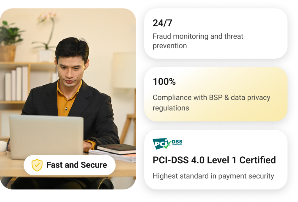 Providing your business with a secure, robust system is our top priority because we want to help you maintain your good reputation. To do so, we are licensed by the BSP, and we have a 4.0 Level 1 compliance with the Payment Card Industry-Data Security Standard (PCI-DSS). We also adhere to the General Data Protection Regulation (GDPR) to ensure that your business and customers’ data are secure. We implement extra layers of security, such as SSL encryption and two-factor authentication, to ensure data privacy and transmission integrity.